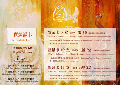 教室主要的課程有幾個種類,分別為初引課程、實煉課程,不同的課程提供不同種類與堂數的課卡。可以依照您想要參加的課程種類與個人運動頻率,自由選擇。